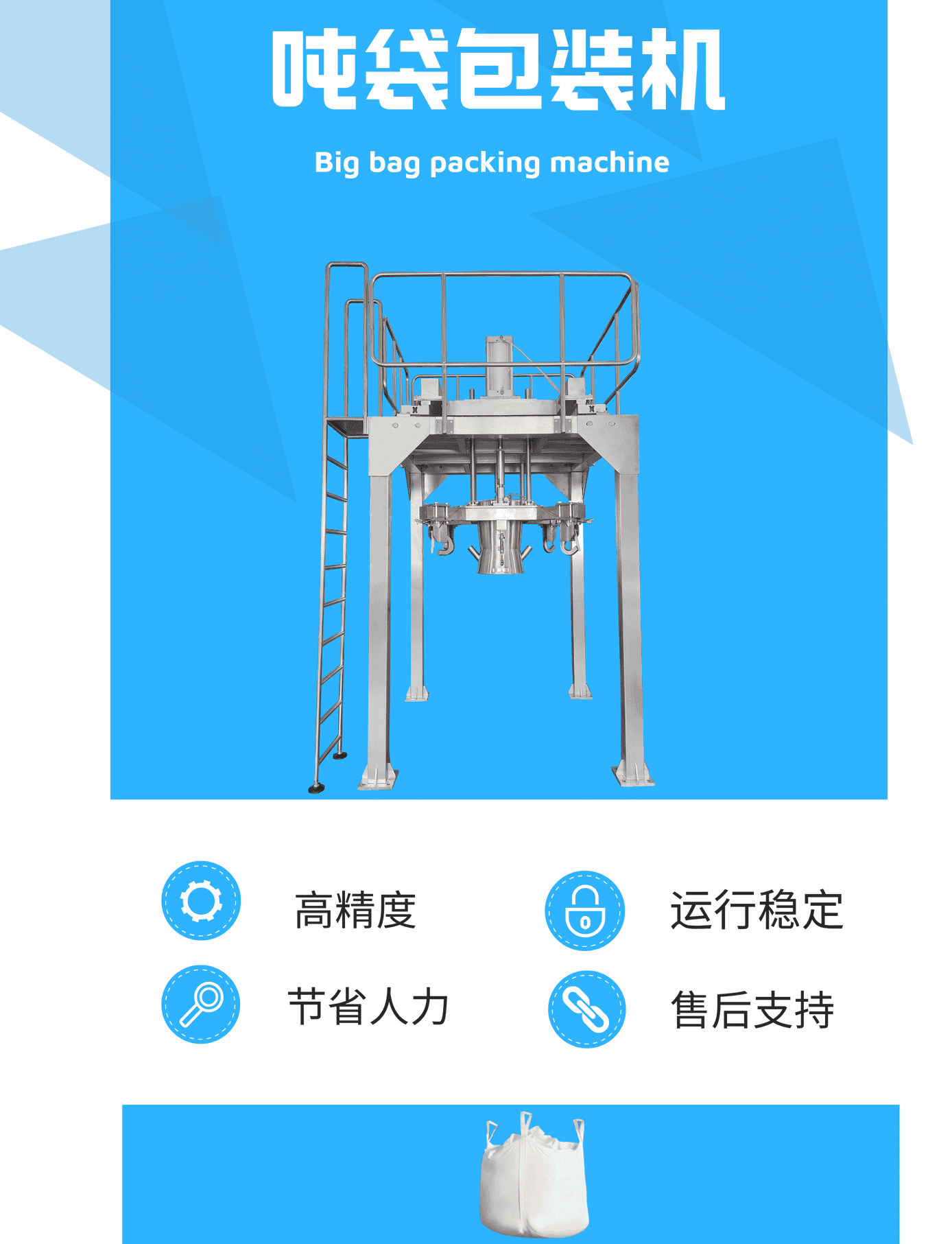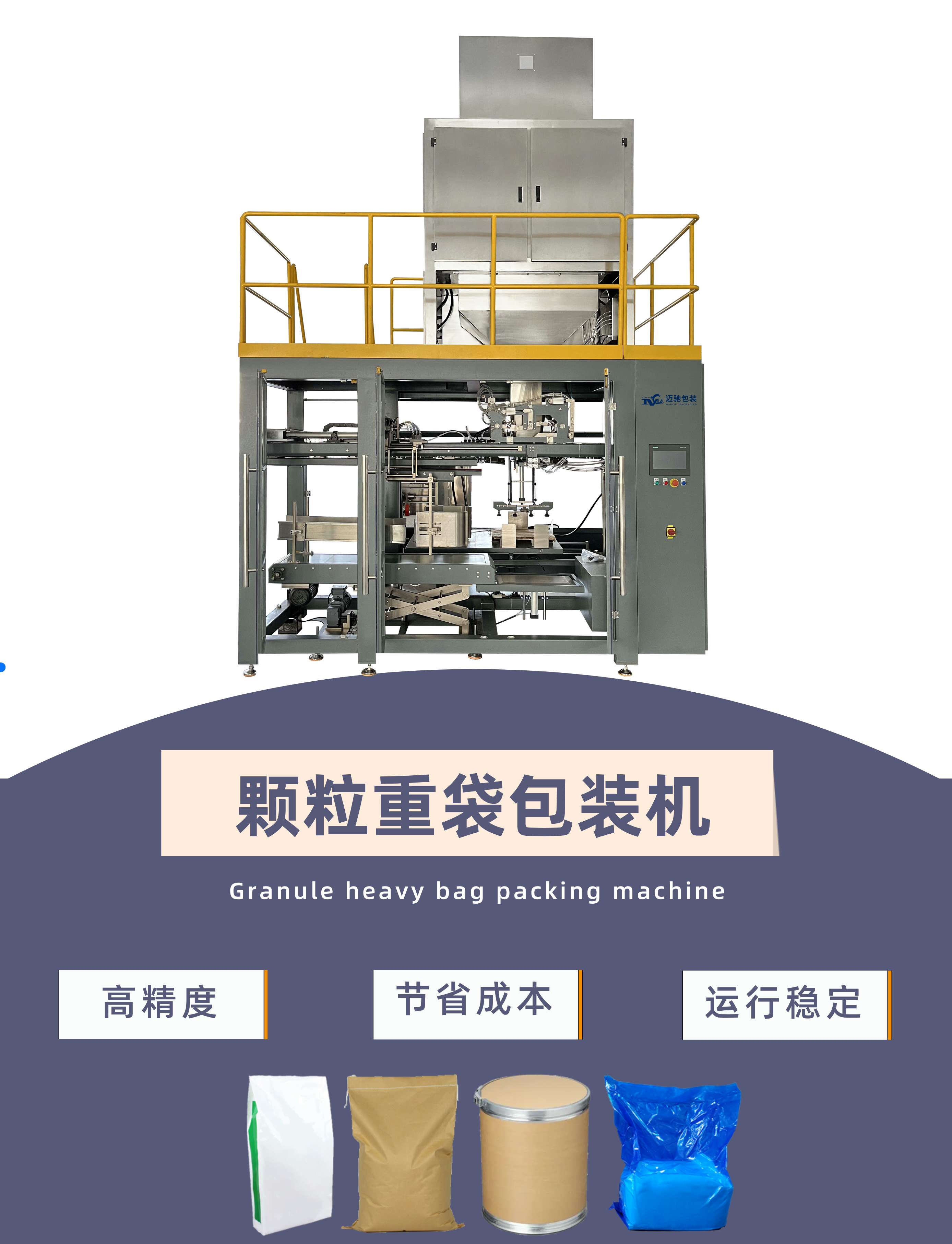 迈驰是一家专业生产全自动颗粒重袋包装机厂家,可根据客户不同粉料特性定制一对一方案,可抽真空定型,高精度计量、无尘化包装。26年包装行业经验,助力生产企业稳定生产...